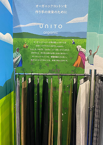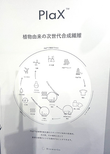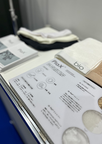 今回、当社ブースでは、環境配慮型素材ブランド「UNITO」の全5カテゴリーに加えて、Bioworks株式会社が開発した「植物由来の添加剤」を活用した新素材「PlaX™(プラックス)」の取り組みをメインで紹介しました
