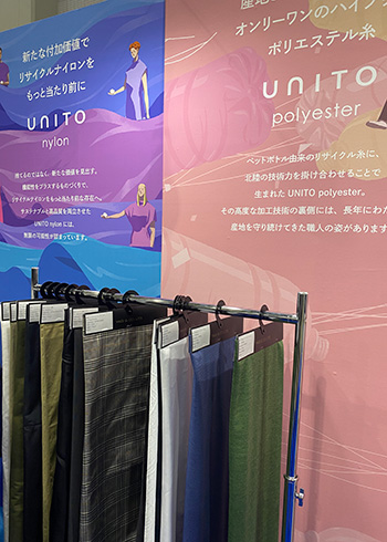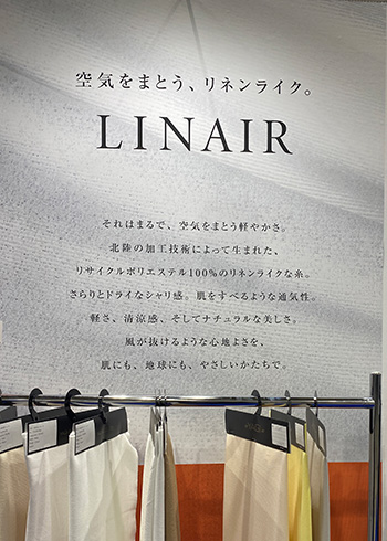 特に、北陸地方の各企業と共同開発しているリサイクル糸ブランド 「UNITO polyester」・「UNITO nylon」はこの展示会には欠かせない商材です。また、この展示会で初めて発表されたのがリネンライクなリサイクルポリエステル糸「リンエアー」。「UNITO Polyester」の糸を使う差別化素材として開発されたもので、リサイクルポリエステルに特殊な加工を施すことで麻調の風合いを実現し、その上更に通気性を持っているという、環境配慮型かつ機能素材です。