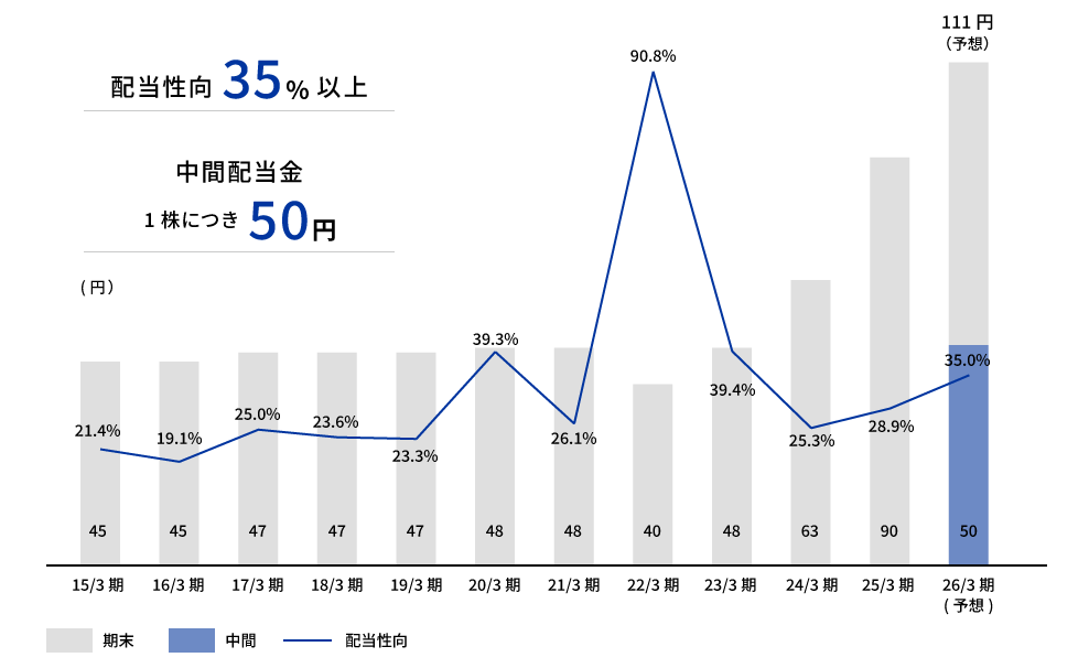 また、株主還元のさらなる強化を目的に、当期より配当方針を「配当性向35%以上」と改定し、期末配当に加えて中間配当も実施いたしました。今後も企業価値の向上に努め、皆様のご期待にお応えできるよう精進してまいります。